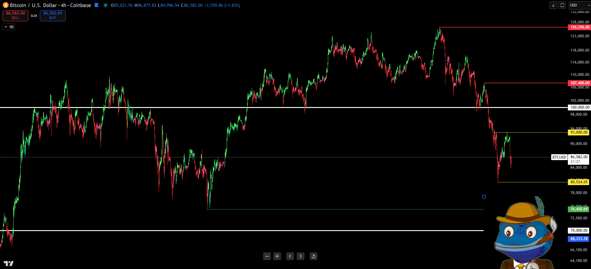 These levels should guide short term trading expectations. If the recent sell off from the ATH is complete, we want to see $80.5k hold, and ideally price reclaim and break above $93k, paving the way for a push toward resistance.